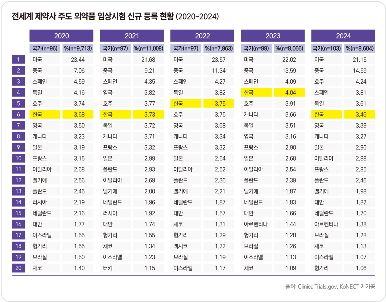 한국 임상시험 점유율 떨어지며, '23년 4위→'24년 6위로 하락