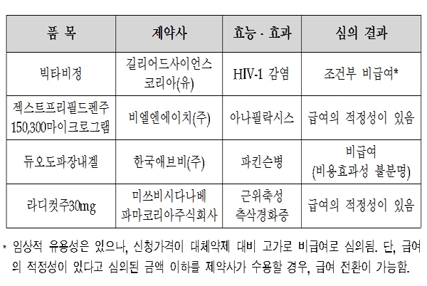 반면 한국애브비의 파킨슨병치료제 듀오도파장내겔(레보도파/ 카르비도파일수화물)은 비급여 판정됐다. 또 길리어드사이언스코리아의 에이즈치료제 빅타비정(엠트리시타빈/테노포비르알라페나미드푸마르산염/ 빅테그라비르나트륨)은 '조건부비급여' 결정됐다.