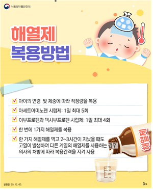아이가 해열제를 복용한 후에도 고열이 지속되는 경우 동일한 해열제를 복용 간격 이내에 반복해서 먹이지 않도록 하고, 의사의 처방에 따라 다른 계열의 해열제를 복용 간격(2~3시간)을 지켜 사용하는 것이 좋다.