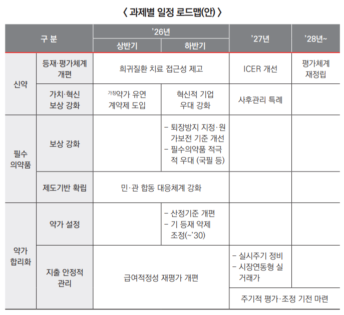 복지부 일정 로드맵에 따르면 2026년 상반기에 의약품의 실제 가격과 표시 가격을 다르게 적용하는 이른 바 '약가 유연계약제'를 도입할 예정이다. 또한 신약의 희귀질환 치료 접근성 제고를 위해 등재 및 평가체계도 개편한다. 필수의약품의 안정적 공급체계를 마련하기 위해 기관 간 의약품 공급·유통 현황을 모니터링하는 민관 합동 대응체계도 상반기 내 시행한다.