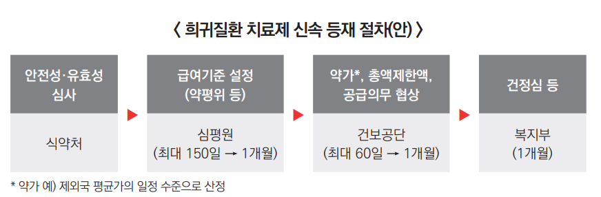 협상 간소화를 통해 희귀질환 치료제의 신속등재를 추진한다. 현 최대 240일 걸리는 급여속도를 100일 이내로 당기겠다는 계획인데, 건강보험심사평가원의 급여기준 설정 단계를 1개월, 국민건강보험공단의 협상 단계를 1개월, 복지부 건정심 1개월로 타임라인을 설정해 100일 이내 급여등재가 가능하도록 하겠다는 것이다.