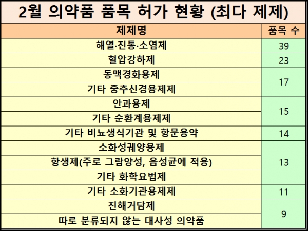 제제별로 ▲ 해열·진통·소염제 (39품목) ▲ 혈압강하제 (23품목) ▲동맥경화용제·기타 중추신경용제제 (17품목) ▲ 안과용제·기타 순환계용제제 (15품목) ▲ 기타 비뇨생식기관 및 항문용약 (14품목) ▲ 소화성궤양용제·항생제(주로 그람양성, 음성균에 적용)·기타 화학요법제 (13품목) ▲ 기타 소화기관용제제 (11품목) ▲ 진해거담제·따로 분류되지 않는 대사성 의약품 (9품목) 등이 뒤를 이었다.