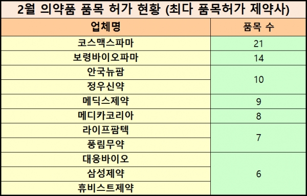 제약사별로는 ▲ 코스맥스파마 (21품목) ▲ 보령바이오파마 (14품목) ▲ 안국뉴팜·정우신약 (10품목) ▲ 메딕스제약 (9품목) ▲ 메디카코리아 (8품목) ▲ 라이프팜텍·풍림무약 (7품목) ▲ 대웅바이오·삼성제약·휴비스트제약 (6품목) 등 순이었다. 주로 중소제약사가 품목허가를 많이 받은 것으로 나타났다.