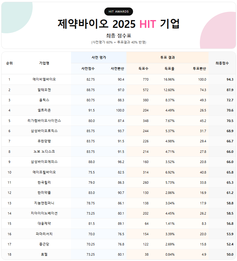 'HIT AWARDS, 제약바이오 2025 HIT 기업'은 단순 인기 투표가 아닌, 보도 데이터 기반 사전평가와 독자 참여 투표를 결합한 복합 평가 방식을 채택했다.