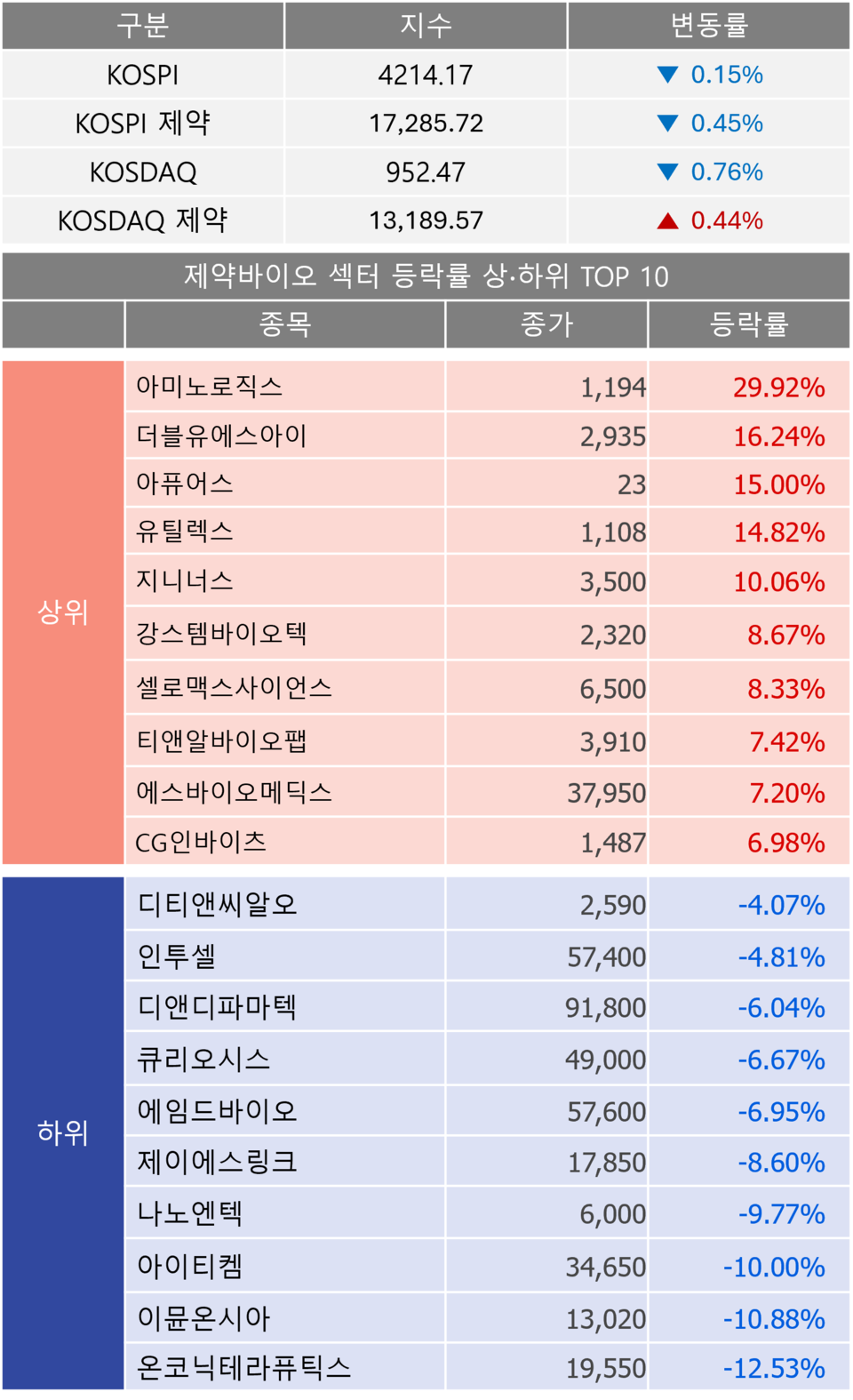 전날 오름세를 보였던 코스피와 코스닥 지수가 동반 하락하고 제약 지수도 다소 불안정한 흐름을 보인 가운데 아미노로직스를 비롯한 일부 제약·바이오 종목이 강세를 보여 시선을 모았다.