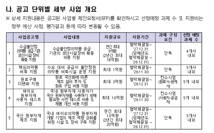 이번 사업은 생산시설 확충, 원부자재 확보, 비축 체계 구축 등 통합적인 공급망 안정화 대응체계를 마련하는 것을 목표로 하며 총 5개 세부 사업으로 구성된다.