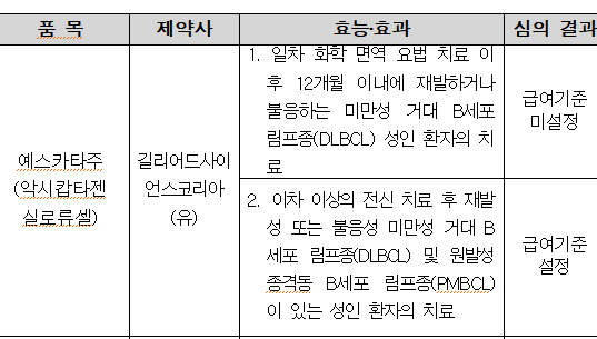 길리어드코리아의 미만성 거대 B세포 림프종(DLBCL) 치료제 '예스카타(성분 악시캅타젠실로류셀)'가 2차 치료에서 급여기준이 미설정됐다.