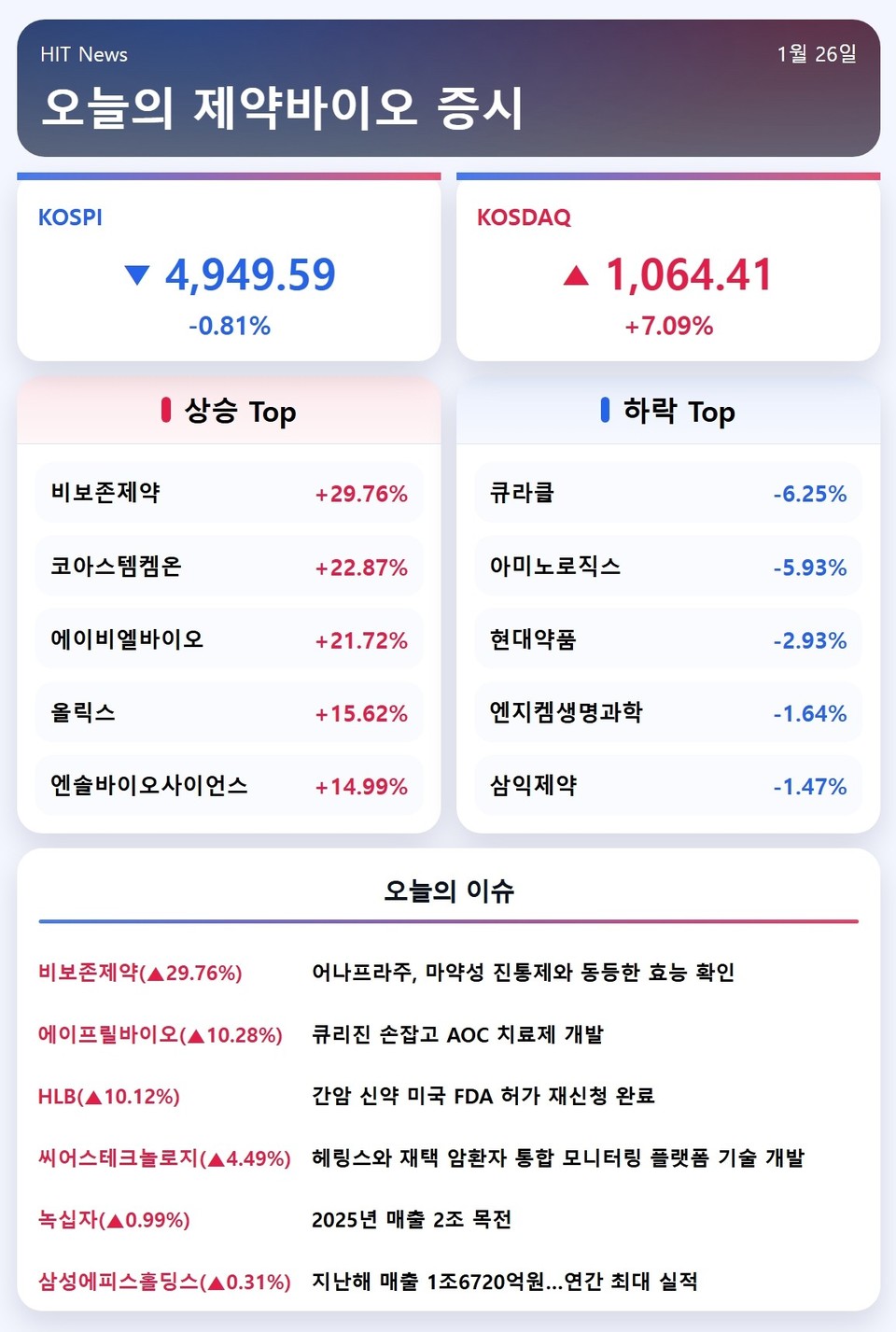 비보존제약(+29.76%), 코아스템켐온(+22.87%), 에이비엘바이오(+21.72%), 올릭스(+15.62%), 엔솔바이오사이언스(+14.99%)