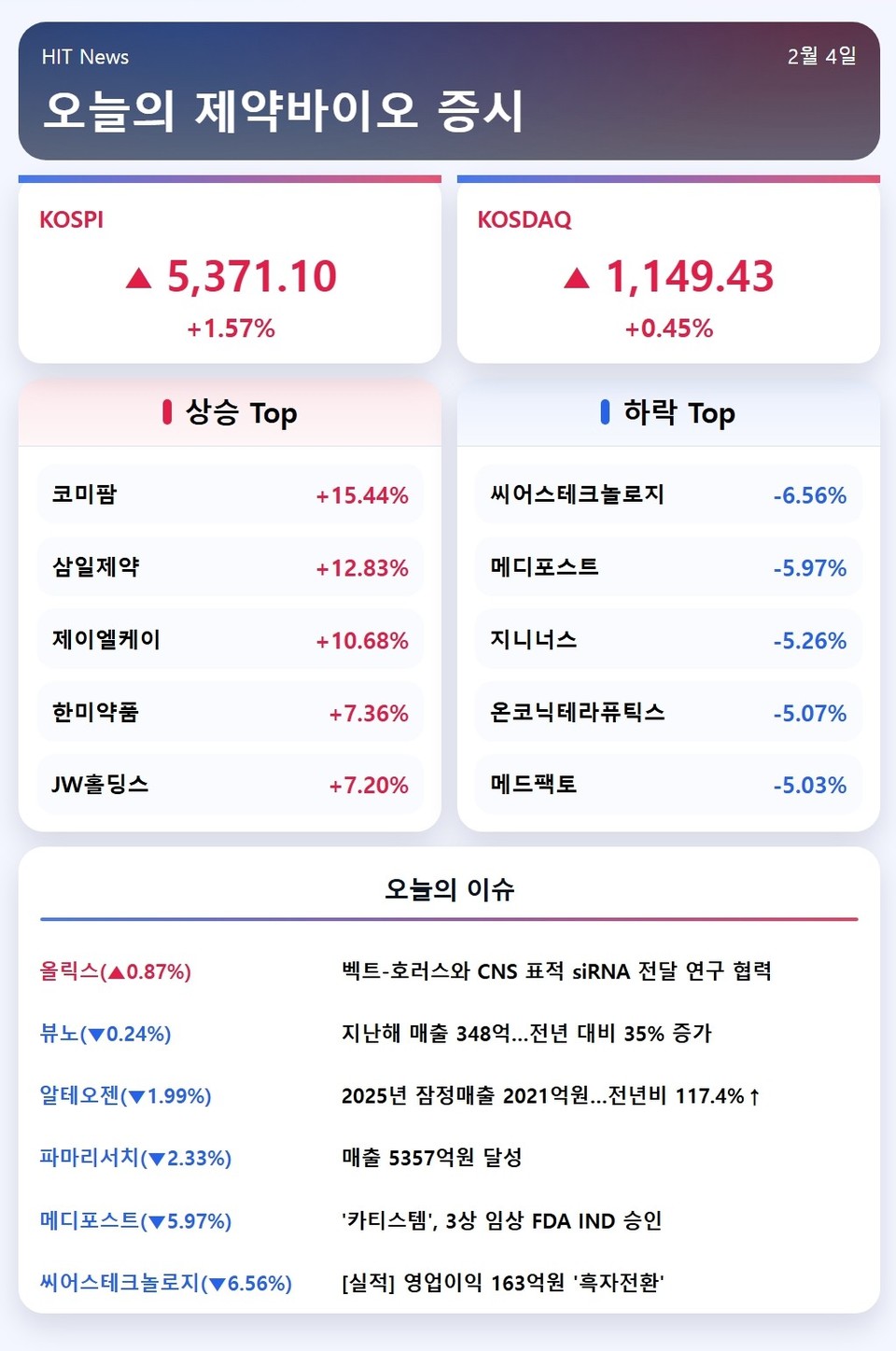 코미팜(+15.44%), 삼일제약(+12.83%), 제이엘케이(+10.68%), 한미약품(+7.36%), JW홀딩스(+7.20%)