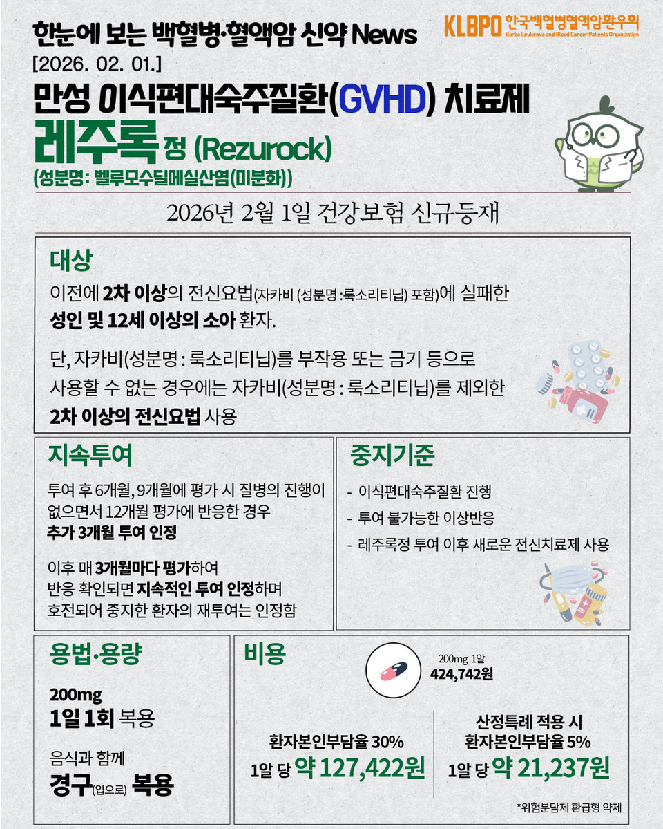 한국백혈병혈액암환우회는 이달 1일부터 만성이식편대숙주질환(cGVHD) 치료제 '레주록정(성분명 벨루모수딜)'에 건강보험 급여가 적용된 것에 대해 환영의 뜻을 밝혔다. 다만 환자의 경제적 부담 경감을 위해 해당 질환을 '산정특례' 대상에 포함해야 한다고 강조했다.