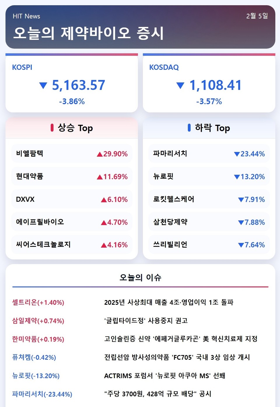 파마리서치(-23.44%), 뉴로핏(-13.20%), 로킷헬스케어(-7.91%), 삼천당제약(-7.88%), 쓰리빌리언(-7.64%)