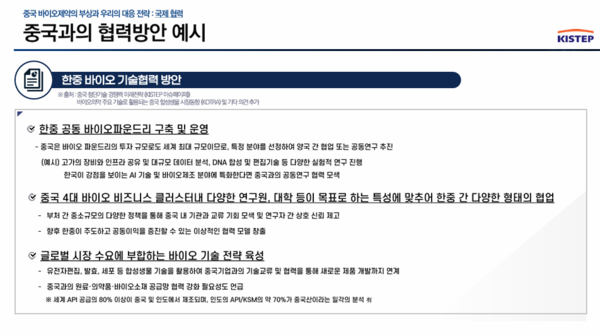 아울러 한국바이오협회가 한중 바이오 산업 협력 지원센터를 설립해 공동 R&D 발굴, 인허가 컨설팅 기업 매칭, 글로벌 진출 지원 등을 추진하는 방안도 소개됐다. 윤 팀장은 이를 "산발적 교류를 넘어 제도화된 협력 창구를 통해 리스크를 관리하면서 기회를 탐색하는 출발점"이라고 설명했다.