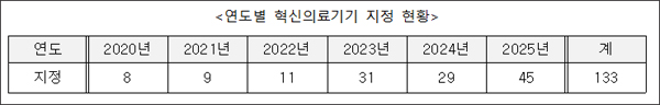 참고로, 2026년 1월 22일자 혁신의료기기로 지정된 제품은 총 123개로 '일반심사 혁신의료기기' 104건, '통합심사 혁신의료기기' 31건이 지정되었다. 여기에는 일반심사로 지정된 제품이 통합심사를 통해 지정된 12건 포함됐다. 2025년 한 해 동안은 인공지능(AI)․빅데이터 등 첨단기술을 적용한 총 45개 제품을 혁신의료기기로 지정했으며, 이는 2024년 29개 대비 약 1.5배 증가한 것이다.