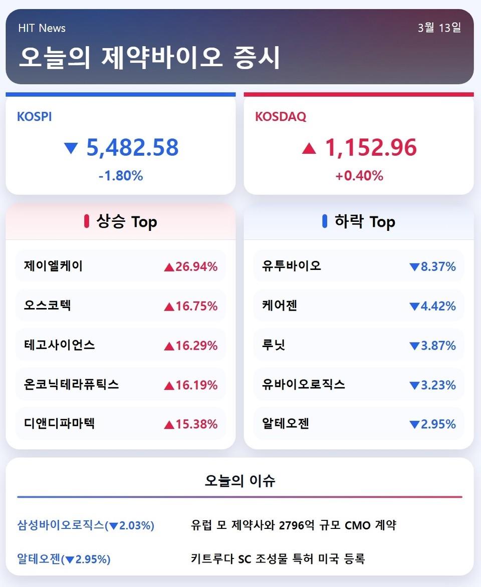 제이엘케이(+26.94%), 오스코텍(+16.75%), 테고사이언스(+16.29%), 온코닉테라퓨틱스(+16.19%), 디앤디파마텍(+15.38%)