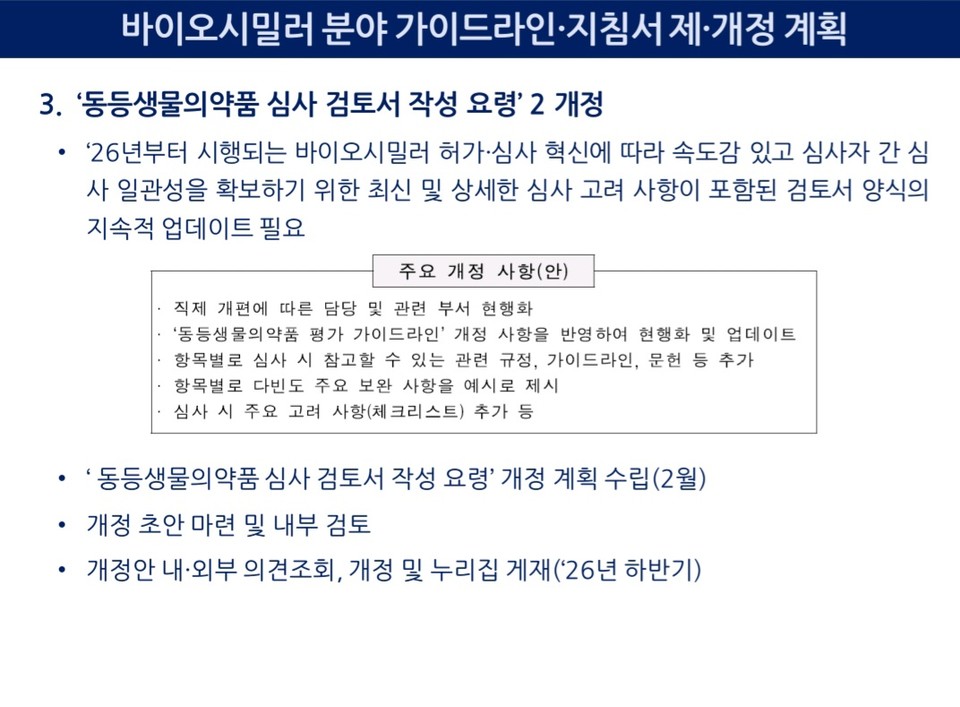 결국 이번 개편은 '속도·표준화·예측 가능성' 세 축으로 요약된다. 식약처는 바이오시밀러 시장의 성장에 발맞춰 심사 체계를 개편해 산업 경쟁력을 끌어올리겠다는 계획이다. 바이오시밀러 심사 패러다임이 구조적으로 전환되는 분기점이 될 전망이다.
