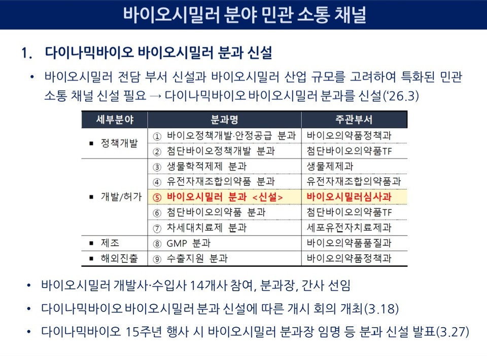 식약처는 최근 다이나믹바이오 바이오시밀러 분과를 신설했다. 바이오시밀러 전담 부서 신설과 산업 규모 확대를 고려해 특화된 민간 소통 채널 구축이 필요하다는 판단에서다.