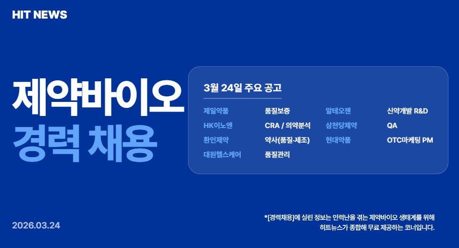 #이직 #채용 #취업 #제약 #바이오 #경력 #제일약품 #HK이노엔 #환인제약 #대원헬스케어 #알테오젠 #삼천당제약 #현대약품 #품질보증 #CRA #품질관리 #R&D #신약개발 #마케팅 #약사