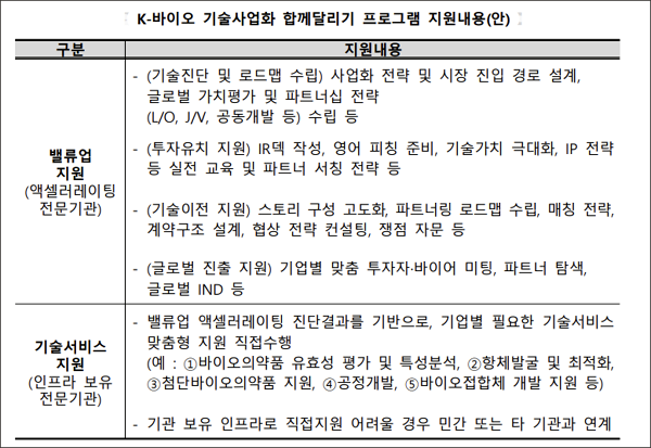 'K-바이오 기술사업화 함께달리기'도 기획했다. 기술개발 전략 수립부터 인프라 활용까지 묶어 지원하는 통합 프로그램이다. 2026년 상반기 기획을 거쳐 2027년 예산 반영을 추진할 계획이다.