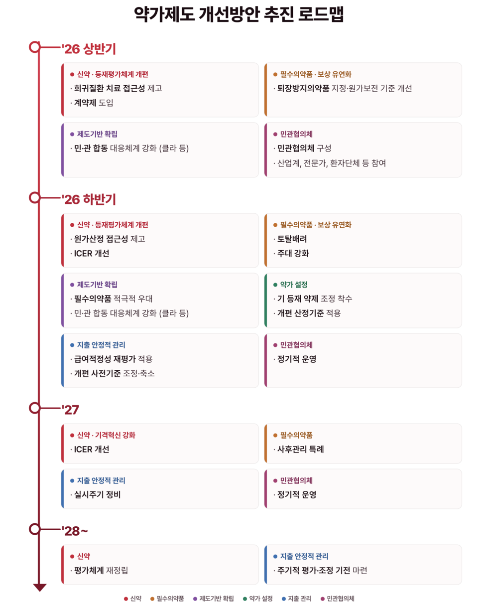 2028년 이후에는 평가체계 재정립이 완료되면서 주기적 평가·조정 기전이 본격 가동된다. 혁신 신약의 신속등재-후평가 조정 트랙이 구축되며 민관협의체가 정기적으로 운영되면서 약가 정책 전반이 '정적 관리'에서 '동적 조정' 체계로 굳는다.