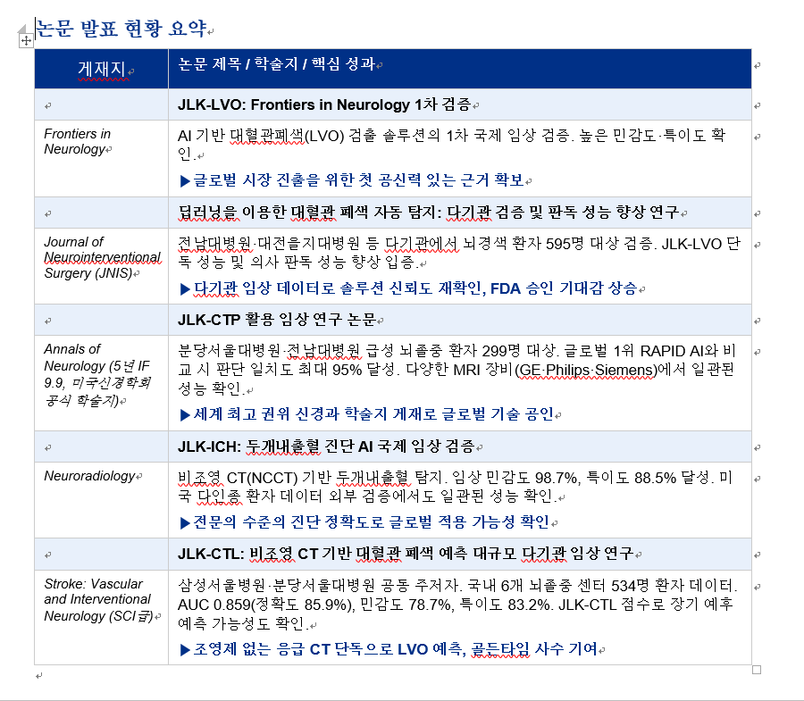 제이엘케이의 AI 기반 대혈관폐색(LVO) 검출 솔루션 JLK-LVO는 2024년 9월 뇌졸중 시술 분야의 저명 국제학술지 Journal of Neurointerventional Surgery(JNIS)에 두 번째 임상 검증 논문을 발표했다. 연구 제목은 '딥러닝을 이용한 대혈관 폐색 자동 탐지: 다기관 검증 및 판독 성능 향상 연구'로, 전남대병원(광주전남 권역뇌혈관센터)·대전을지대학교병원 등 다기관 뇌졸중 전문의가 참여했다.