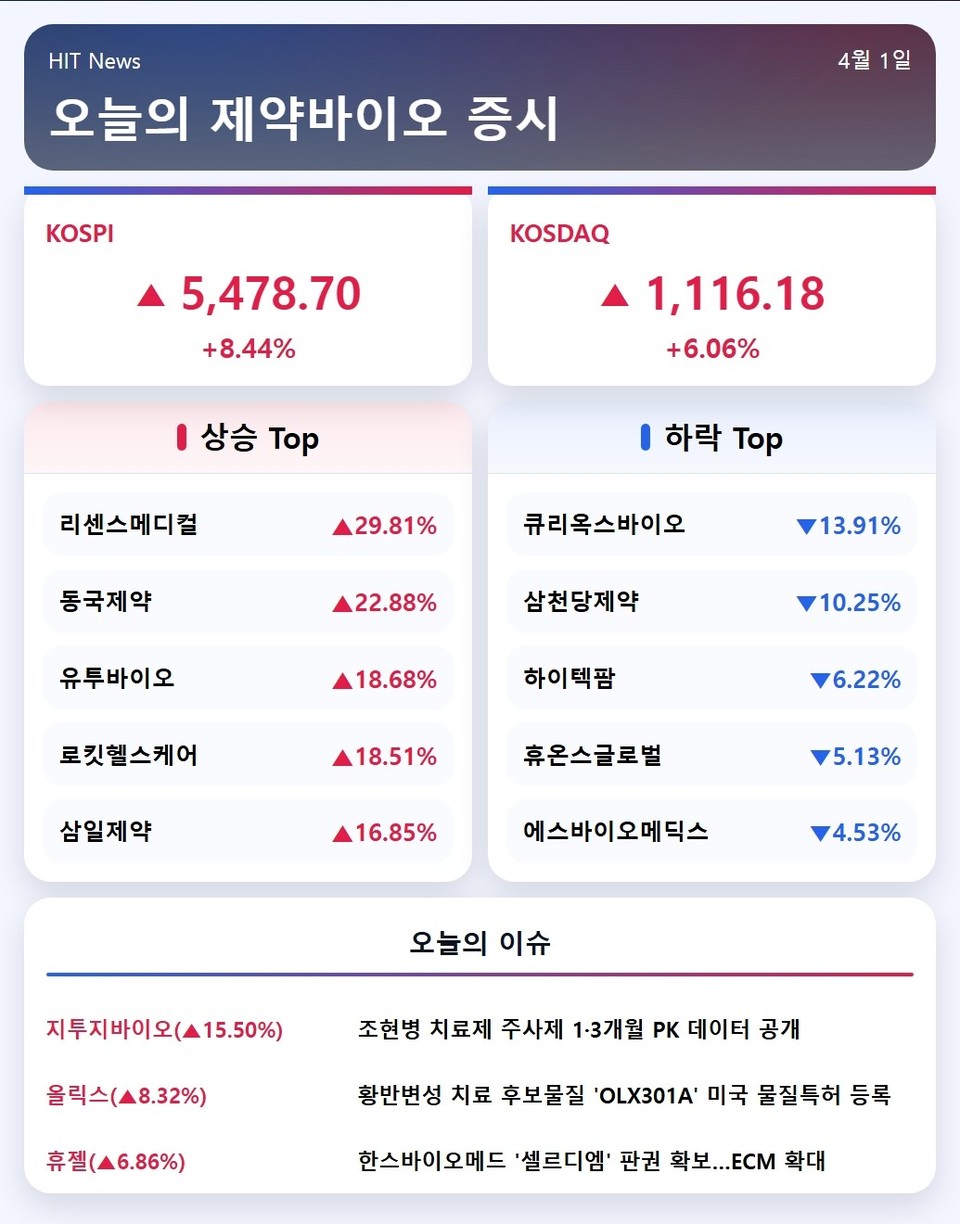 리센스메디컬(+29.81%), 동국제약(+22.88%), 유투바이오(+18.68%), 로킷헬스케어(+18.51%), 삼일제약(+16.85%)