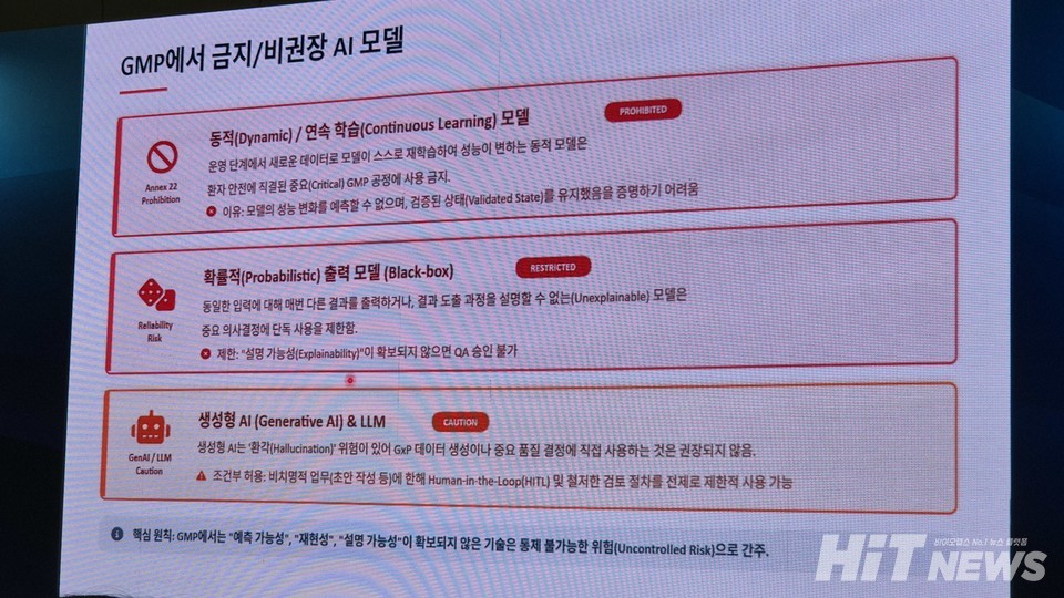 그는 "챗GPT나 제미나이처럼 계속 업데이트되는 모델은 GMP 환경에서는 그대로 사용할 수 없다"며 "이와 같은 모델은 버전을 고정하고 변경 시마다 밸리데이션을 다시 수행해야 한다"고 말했다.