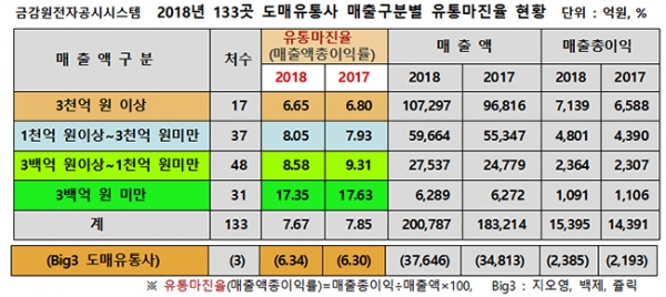 또한, '300억 원 이상~1000억 원 미만'의 48곳 중소형사 들은 작년(2018년) 8.6%, 재작년(2017년) 9.3%로, 도매유통업계의 숙원인 유통마진율 8.8%대를 오르내렸다.