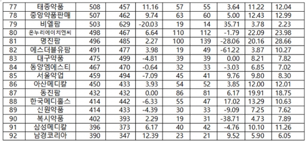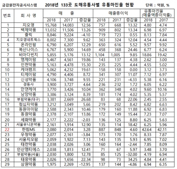 이에 대해, 2018년 매출액 300억 원 미만의 31곳 소중형 유통사들의 유통마진율은 무려 17.4%나 되는 것으로 나타났다. 이들은 유통마진율 무풍지대라 할 수 있다. 이들 소중형 유통사들은 도매유통업계에서 업체 수 비중 최소 85% 이상(2017완제의약품유통정보통계집, 심평원)을 차지하는 대집단이다.