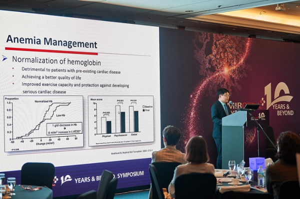 16일 심포지엄에서는 인제대학교 부산백병원 신장내과 김영훈 교수가 좌장을 맡고 순천향대학교부속 천안병원 신장내과 길효욱 교수, 가천대 길병원 신장내과 노한 교수가 발표자로 참석하여 유럽신장학회 연례 회의에서 발표된 만성 신질환 환자 빈혈 치료의 최신 지견을 공유하고 심질환 관련 합병증의 관리 방안에 대해 논의하는 시간을 가졌다.