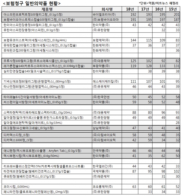 히트뉴스가 2018년 보험청구 상위 1000대 품목 중 일반의약품을 분석한 결과 이 같이 나타났다.
