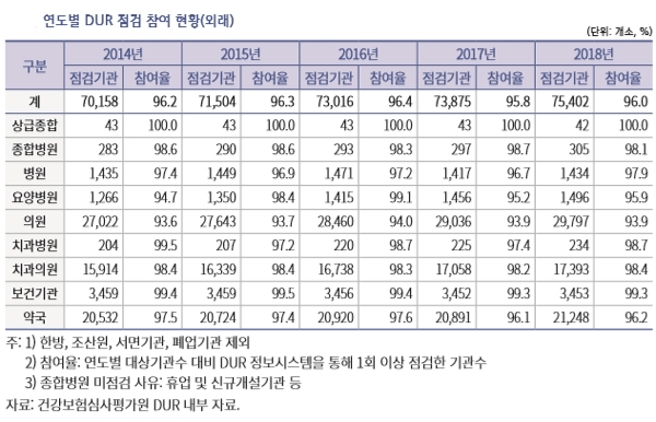 DUR 점검 참여 현황=2010년 12월 시범사업을 거쳐 DUR 점검이 전국으로 확대된 후 DUR 점검 참여율은 2011년 1월 27.6%에서 2014년 96.2%로 급증했고, 이후 현재까지 약 96% 정도의 높은 참여율을 보이고 있다.