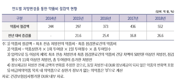 연도별 전년 대비 증감율은 매년 약 5%p 꾸준히 성장한 것을 알 수 있다. 또 부적절의약품 사용예방을 통해 절감된 약품비는 2014년 244억 원에서 2018년 552억 원으로 매년 전년대비 16~26% 이상 늘었다.
