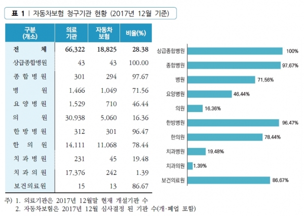의료기관 4곳 중 1곳 이상이 지난해 자동차보험으로 진료비를 청구한 것으로 나타났다. 기관수는 한의원이 절반 이상으로 가장 많았다. 진료비는 1조7000억원을 넘어섰는데, 외래와 한방분야 증가세가 뚜렷했다.