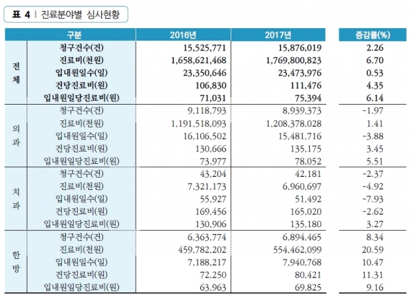 건당진료비는 치과분야 16만5020원, 의과분야 13만5175원, 한방분야 8만421원이었다. 증가율은 한방 11.31%, 의과 3.45%, 치과 2.62%로 진료비 크기의 역순이었다.