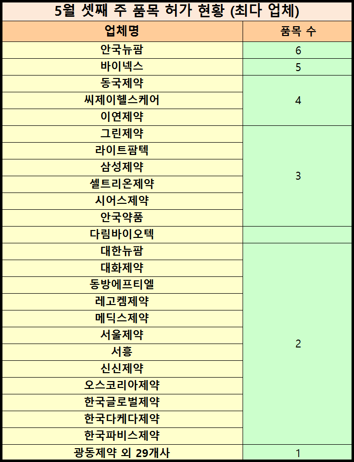 업체별로는 ▲ 안국뉴팜 (6품목) ▲ 바이넥스 (5품목) ▲ 동국제약·씨제이헬스케어·이연제약 (4품목) ▲ 그린제약·라이트팜텍·삼성제약·셀트리온제약·시어스제약·안국약품 (3품목) ▲ 다림바이오텍·대한뉴팜·대화제약·동방에프티엘·레고켐제약·메딕스제약·서울제약·서흥·신신제약·오스코리아제약·한국글로벌제약·한국다케다제약·한국파비스제약 (각 2품목) ▲ 광동제약·구주제약·뉴젠팜·대웅제약·대웅바이오·대원제약·동구바이오제약·씨티씨바이오·아리제약·아주약품·알피바이오·유니메드제약·유한양행·오스틴제약·이니스트바이오제약·일양약품·일화·제이에스제약·제일헬스사이언스·정우신약·주식회사다나젠·중헌제약·조아제약·코스맥스파마·콜마파마·태극제약·테라젠이텍스·한국신약·한국파마·현대약품 (각 1품목) 등의 순으로 많았다.