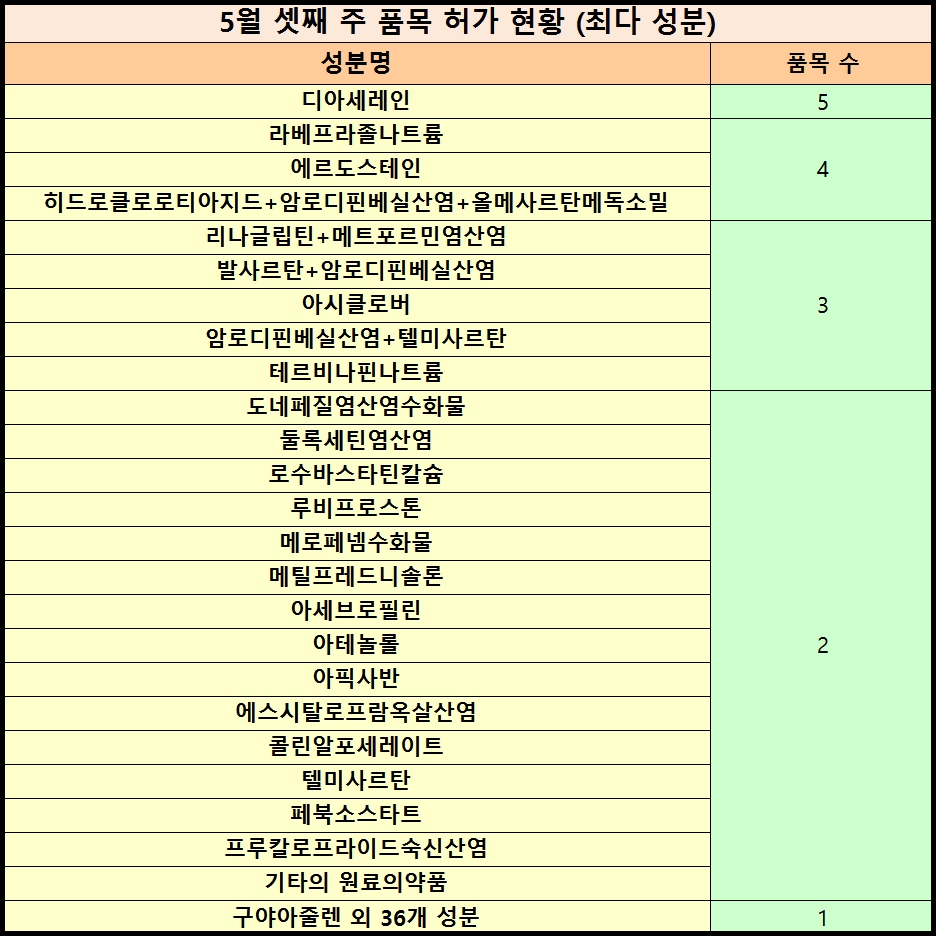 성분별로는 ▲ 디아세레인 (5품목) ▲ 라베프라졸나트륨·에르도스테인·히드로클로로티아지드+암로디핀베실산염+올메사르탄메독소밀 (각 4품목) ▲ 리나글립틴+메트포르민염산염·발사르탄+암로디핀베실산염·아시클로버·암로디핀베실산염+텔미사르탄·테르비나핀나트륨 (각 3품목) ▲ 도네페질염산염수화물·둘록세틴염산염·로수바스타틴칼슘·루비프로스톤·메로페넴수화물·메틸프레드니솔론·아세브로필린·아테놀롤·아픽사반·에스시탈로프람옥살산염·콜린알포세레이트·텔미사르탄·페북소스타트·프루칼로프라이드숙신산염·기타 원료의약품 (각 2품목) ▲ 구아야줄렌 외 총 36개 성분 (각 1품목) 등으로 분포했다.