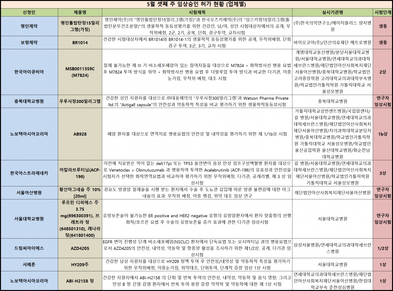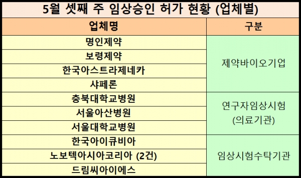 ▶ 임상 승인 현황 = 같은 기간 총 11건의 임상시험이 승인됐다. 시험단계별로 ▲ 생동 (2건) ▲ 1/2상 (1건) ▲ 1상 (2건) ▲ 1b상 (1건) ▲ 2상 (1건) ▲ 3상 (1건) ▲ 연구자임상시험 (3건) 등으로 나타났다.