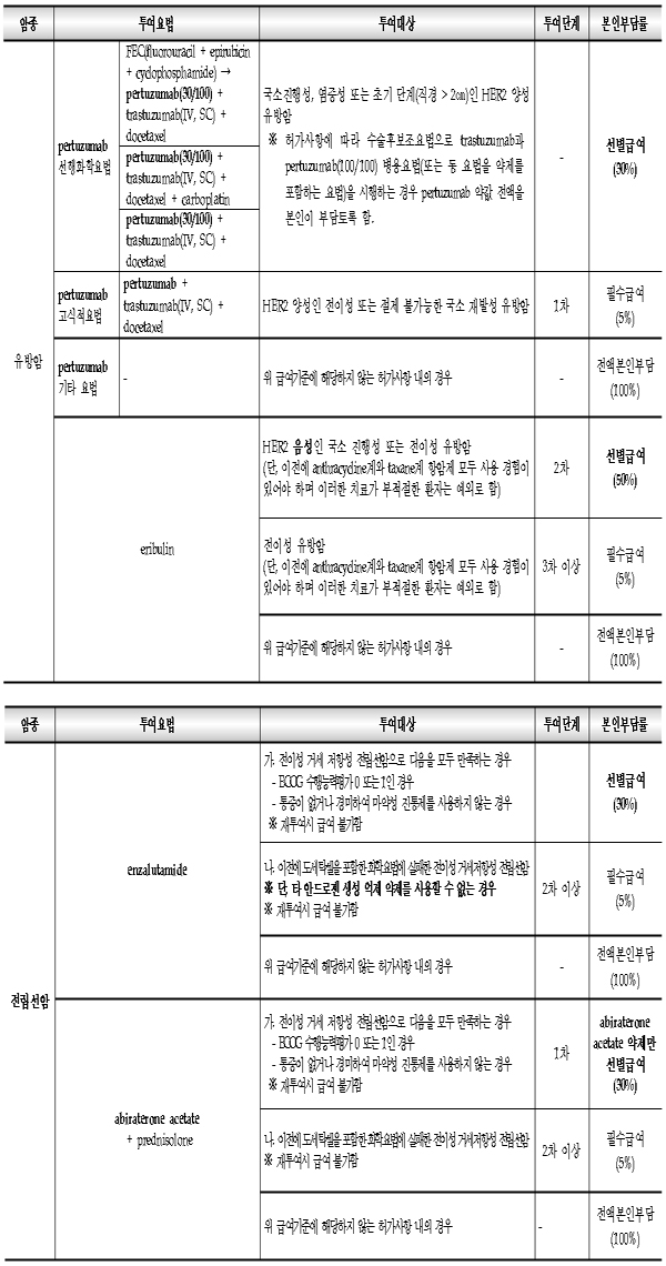 오늘(20일)부터 유방암치료제 퍼제타주(퍼투주맙)의 일부 요법과 할라벤주(에리불린) 일부 적응증, 전립선암치료제 엑스탄디캡슐(엔자루타미드)과 자이티가정(아비라테론)의 일부 적응증에 선별급여가 개시된다.
