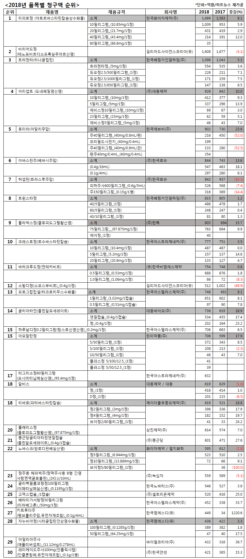 히트뉴스가 2017~2018년 보험청구액 상위 1000품목을 분석한 결과, 80mg을 순위권에 처음 진입시킨 리피토가 전년대비 8.1% 성장한 1689억을 청구하면서 4.1% 하락한 비리어드를 제치고 1위를 차지했다. 2018년 상반기 까지는 비리어드가 812억으로 리피토를 7억 차이로 따돌렸다.