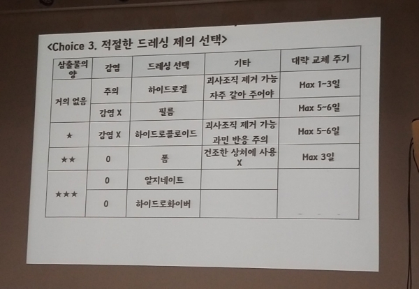 김 약사는 세척과소독, 항생제 연고, 적절한 드레싱제 선택, 흉터 예방과 관리 등이 상처지유에 있어서 중요한 4가지 요소라고 했다. 그는 구체적으로 "소독은 상처 부위가 아닌 상처 주변 부위를 소독하는 것이다. 체온과 유사한 온도의 생리식염수나 흐르는 물로 세척하는 게 좋다. 포비돈-요오드 용액의 경우가 감염위험이 높은 상처, 수술 전 소독 등 꼭 필요한 상황에만 사용을 권장한다"고 했다.