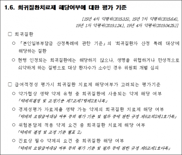 희귀질환치료제 평가기준=종전에는 희귀질환 선별기준을 따로 명시했었다.