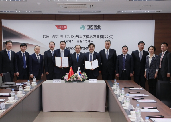 바이넥스는 송도 공장에서 중국 충칭 즈언 제약회사와 중국 내 토탈헬스케어 사업의 첫 단계로 바이오의약품 사업을 위한 한·중 합작법인 설립 계약을 31일 체결했다.