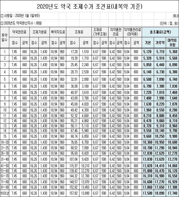 조제료는 1일분 1510원, 2일분 1710원, 3일분 2240원, 5일분 2890원, 7일분 36100원, 10일분 4350원, 15일분 6050원, 30일분 8420원, 60일분 1만2270원, 90일분 1만34500원, 91일 이상 1만3890원 등이다.