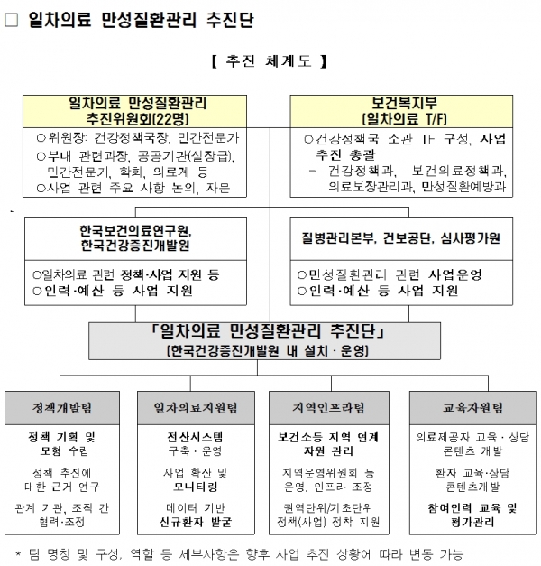 복지부는 추진단과 함께 권준욱 건강정책국장과 이건세 교수(건국대학교 의학전문대학원)를 공동위원장으로 관계 전문가, 학회, 의료계, 환자 · 소비자 단체 대표 등으로 구성한 ?일차의료 만성질환관리 추진위원회?를 운영한다.