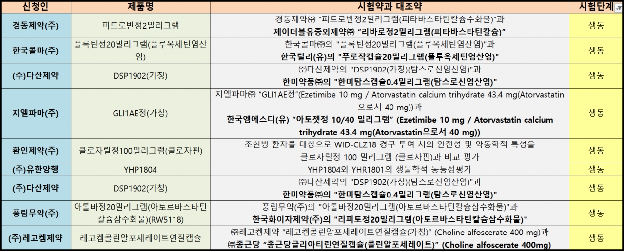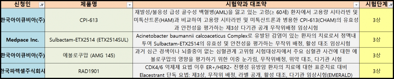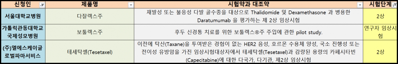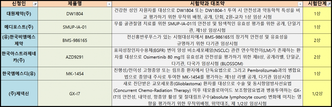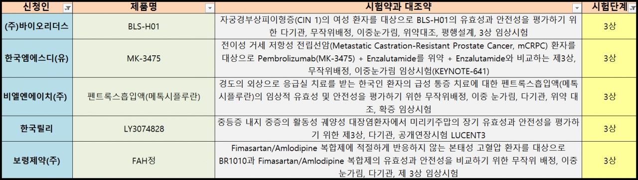 임상 승인 현황 = 지난 2주간 총 30건의 임상시험이 식약처로부터 승인받았다. 신청인별로 보면 (중복포함) 제약사 21건, CRO(임상시험수탁기관) 5건, 바이오기업 3건, 의료기관 2건 순이었다. 시험단계별로는 3상 9건, 1상·2상 각 5건), 연구자임상시험·1/2상 각 1건이었다. 생동시험은 9건 승인됐다.