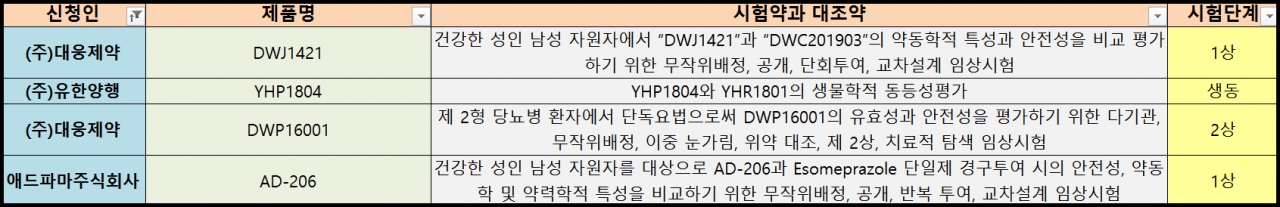 지난 2주간 임상시험 승인건수를 보면 대웅제약과 유한양행이 두드러졌다. 대웅제약은 당뇨병치료제(SGLT-2 억제제) 임상 2상과 류마티스관절염 치료제 임상 1상을 승인받았다. 유한양행은 자회사 '애드파마'를 통해 역류성식도염 치료제 (PPI제제) 임상 1상에 돌입했다.