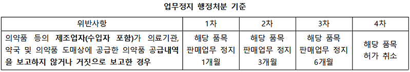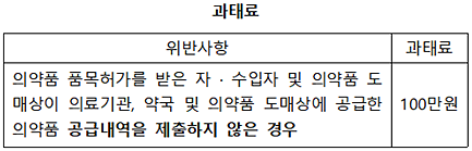 구체적으로 의약품 공급내역을 기한 내 보고하지 않거나 거짓 보고한 경우 100만 원의 과태료와 해당 품목 판매 정지 및 품목 허가 취소 처분이 적용된다.