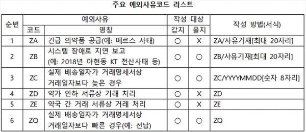 부득이하게 일련번호를 보고할 수 없는 경우=주요 예외사유코드는 ZA(긴급 의약품 공급), ZB(시스템 장애로 지연 보고, ZC(실제 배송일자가 거래명세서상 거래일자보다 늦은 경우, ZD(약가 인하 서류상 거래 처리), ZE(약국 간 거래 서류상 거래 처리), ZQ(실제 배송일자가 거래명세서상 거래일자보다 빠른 경우)가 있다.