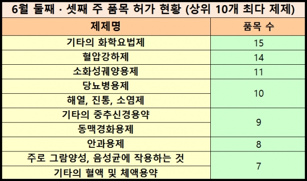 16일 식품의약품안전처에 따르면 지난 열흘간(3~14일) 29개 질환군에서 133개 품목이 시판허가를 받았다. 이중 제네릭은 101품목으로 전체 허가 품목 중 89%를 점유했다. 품목 허가 상위 10개 질환군은 ▶ 기타의 화학요법제 (15품목) ▶ 혈압강하제 (14품목) ▶ 소화성궤양용제 (11품목) ▶ 당뇨병용제·해열,진통,소염제 (10품목) ▶ 기타의 중추신경용약·동맥경화용제 (9품목) ▶ 안과용제 (8품목) ▶ 주로 그람양성, 음성균에 작용하는 것 (7품목) ▶ 기타의 혈액 및 체액용약 (6품목)이었다.