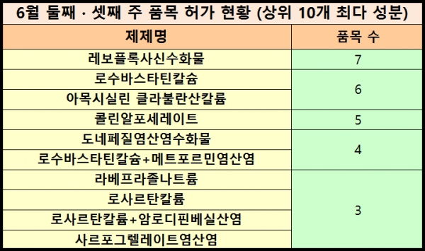또 상위 10개 성분은 ▶ 레보플록사신 수화물 (퀴놀론계 항생제/7품목) ▶ 로수바스타틴칼슘 (고지혈증 치료제/6품목)·아목시실린-클라불란산칼륨 (페니실린계 항생제/6품목) ▶ 콜린알포세레이트 (뇌기능 개선제/5품목) ▶ 도네페질염산염수화물 (치매 치료제/4품목) ▶ 로수바스타틴칼슘+메트포르민염산염 (당뇨+고지혈증 복합제 / 4품목) ▶ 라베프라졸나트륨 (위궤양제/3품목)·로사르탄칼륨 (고혈압 치료제/3품목)·로사르탄칼륨+암로디핀베실산염 (고혈압 복합제/3품목)·사르포그렐레이트염산염 (만성 동맥폐색증 치료제/3품목) 등으로 파악됐다.